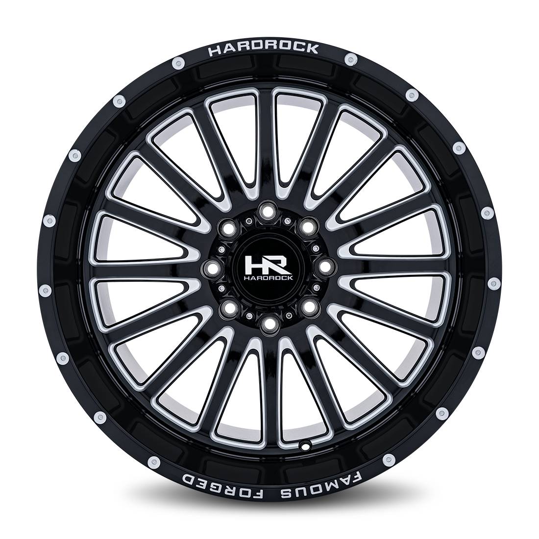 The Hardrock H802 Famous Forged wheels are a take on a classic beauty. It has sixteen evenly spaced thin spokes that sunburst out from the hub. This perfectly symmetrical design is as structurally sound as a spoked wheel can be. Weight is distributed evenly across the barrel and hub all while maintaining the shortest possible length of the individual spokes. Impact and motion stress has a direct line to the axel. It is truly the most efficient design method possible.